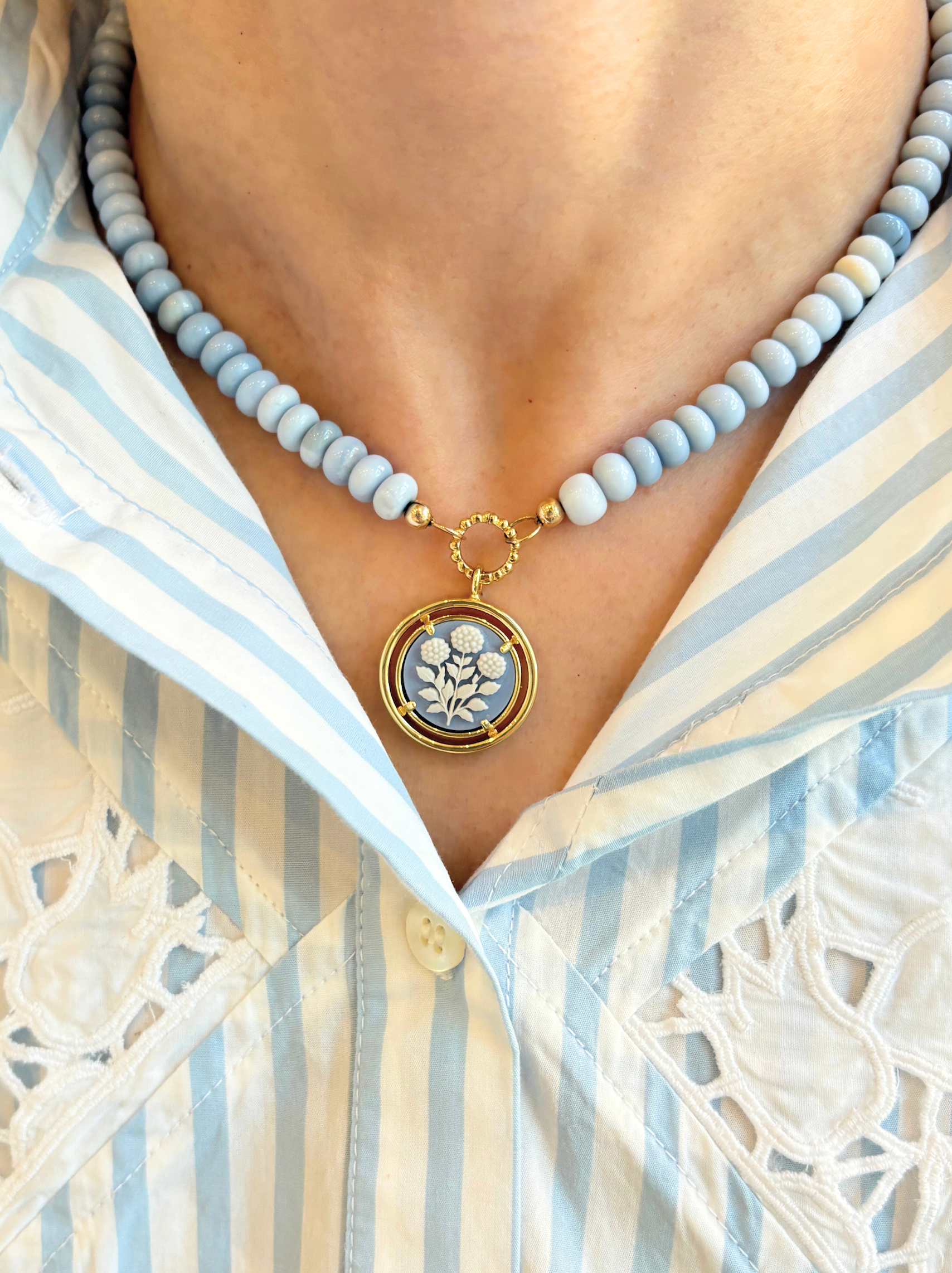 A modern heirloom in bloom. Our signature Cape Cameo Coin features a delicate raised floral motif in resin reminiscent of vintage cameo pendants. Our coin is crafted with ethically sourced materials and plated in luminous 18k gold featuring our favorite hydrangea bloom that was hand-sketched. This includes the coin only, but we love to pair it with our Skipper Strands for a fun pop of color or visit our full Cape Cameo Necklace to add the matching chain.